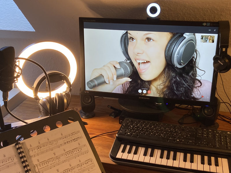Durch die kleine, aber nicht zu vermeidende Zeitverschiebung (Latenzzeit) ist es nicht möglich, dass ich dich bei deinen Stücken live am Klavier begleite und du dazu singst. Dies ist aber kein Problem, da ich dir deine Begleitmusik und deine Texte als Playback per Mail zusende und du diese dann bei dir abspielst, bzw. ausdruckst. Nutze dafür ein separates Gerät, z.B. dein Handy, wenn du deinen Laptop für unseren Videochat parallel nutzt. Bei Gesangsübungen und zum Einstudieren von neuen Stücken ist die Latenzzeit aber kein Problem und ich nutze mein Piano.